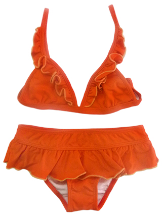 Biquini infantil,sem bojo, triângulo, cós medio com detalhe de babados. Na cor laranja.